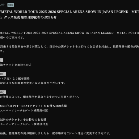 「BABYMETAL WORLD TOUR 2025-2026 SPECIAL ARENA SHOW IN JAPAN LEGEND – METAL FORTH」グッズ販売 紙整理券配布のお知らせ 「BAB…