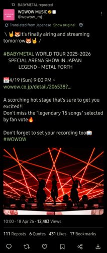 べビメタだらけの・・・2026.04.19【海外】WOWOWでBABYMETAL「LEGEND – METAL FORTH」が放送される ポスト シェア はてブ 送る Pocket 【海外】WOWOWでBABYMETAL「LEGEND – METAL FORTH」が放送される 元の情報源: \🤘🦊いよいよ明日放送&配信🦊🤘/#BABYMETAL WORLD TOUR 2025-2026 SPECIAL ARENA SHOW IN … [紹介元] べビメタだらけの・・・ 続きを読む 【Amazon.co.jp限定】「BABYMETAL – LIVE AT THE O2 ARENA」完全生産限定盤(Blu-ray) 特典 : ハンドタオル、ライブ写真 A3ポスター(メーカー共通特典)付き [Blu-ray] created by Rinker BMW FOX RECORDS / アミューズ Amazon 【Amazon.co.jp限定】METAL FORTH (デラックス・エディション)(特典:メガジャケ付) created by Rinker UNIVERSAL MUSIC GROUP Amazon BABYMETAL LEGEND – 43 THE MOVIE (Blu-ray) created by Rinker トイズファクトリー Amazon